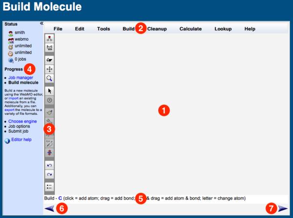 - 1. Editor Window: area for building and editing atoms, bonds, and molecules