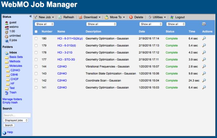 The Job Manager is the initial window that a user encounters upon loggin in to WebMO. The left panel displays user information and the list of folders. The top menu is for creating and managing jobs. The main part of the page lists jobs that have been run or submitted.