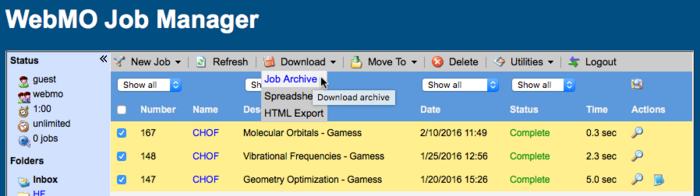 The View Job page can be exported into a *.tar file, which can then be uploaded to web server and expanded for subsequent viewing. The *.tar file contains not only the data but also the files necessary for the page to look exactly like it would were it to be accessed from a WebMO server instance. This makes it possible to view the results of calculations on a webserver without having to install an instance of WebMO itself.