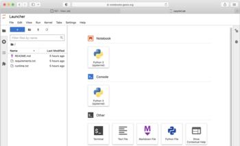 A webpage containing JupyterLab will open up with a menu, file navigator, and launcher. Note that the URL for a locally-installed instance will be something like: