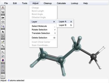 Layers are sets of atoms used within subsequent calculations. WebMO supports two layers: A and B. Every atom is in either layer A or layer B. If two layers exist (ie, there are both A and B atoms), then subsequent calculations use the layer information when appropriate. If only one layer exists (ie, all atoms are in layer A, or all are in layer B), then the layer information is ignored.