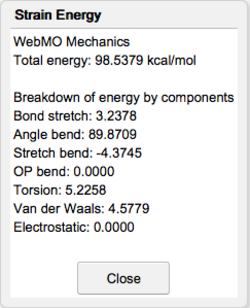 The mechanics energy of the current geometry is calculated with the Calculate: Strain Energy menu item. The molecular geometry is optimized by minimizing the mechanics energy with Cleanup: Mechanics Optimize. Choosing Cleanup: Comprehensive - Mechanics does a full cleanup (add hydrogens, adjust hybridization, and optimize geometry) using mechanics.