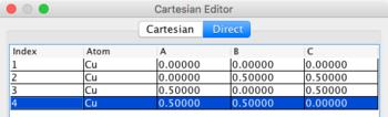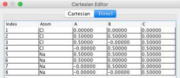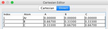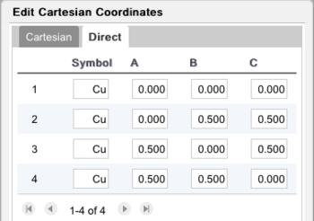 Although atom positions may be entered using Cartesian coordinates (X, Y, Z), it is more typical to enter them in direct or fractional coordinates (a, b, c), in which positions are specified by 0 to 1 along each lattice vector.