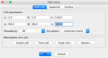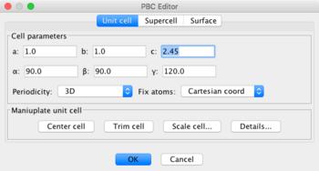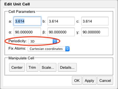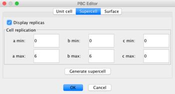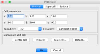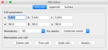 The PBC editor is invoked with Tools: PBC: Unit Cell... In order for periodic boundary conditions to be active, the Periodicity must be selected for 1D, 2D, or 3D.