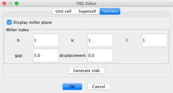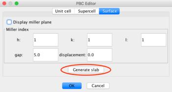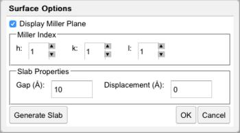 To generate a surface (i.e., introduce a vacuum gap between bulk layers), specify the miller plane along which the surface should be created, the size of the gap in Angstroms, and a displacement from the plane. Click Generate slab followed by OK. Click Yes or No in response to automatically generating bonds based on internuclear separation.