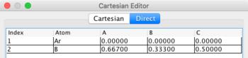 Click the Direct tab on the Cartesian Editor. Click the Add atom button. Edit the Atom element and coordinates. Repeat until all the unique atoms are entered.