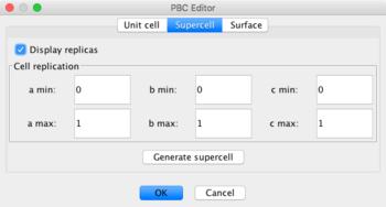 Additional unit cell replicas can be generated in each periodic dimension with Tools: PBC: Supercel.... Specify the number of replicas to be added before and after the unit cell in each dimension.