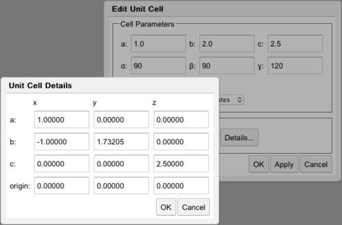 The definition of the unit cell lattice vectors in terms of Cartesian coordinates can be viewed or edited by clicking the Details... button.