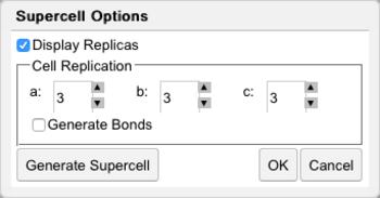 To add the replicated the replicated atoms and expand the unit cell to include them, click Generate supercell followed by OK. Click Yes or No in response to automatically generating bonds based on internuclear separation.