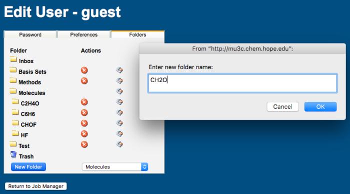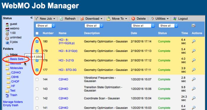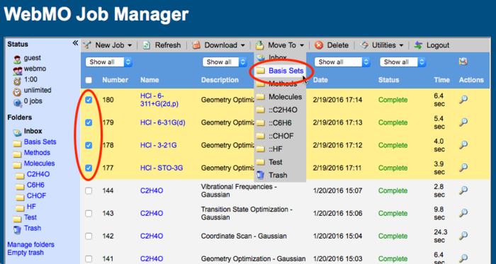 WebMO allow users to organize their jobs in folders. WebMO Basic has only Inbox and Trash Folders. WebMO Pro and Enterprise users can create user-define folders and subfolders, which is ideal for organizing multiple projects or saving important jobs without cluttering up the Inbox.